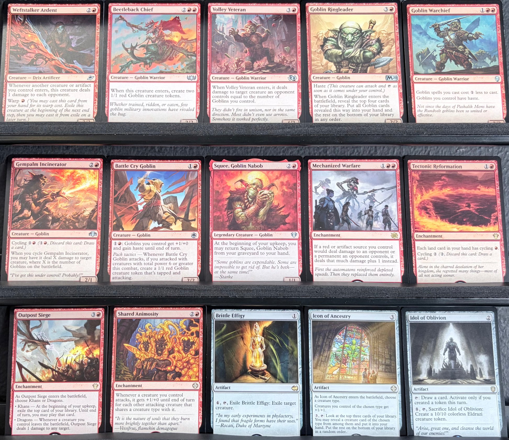 • Utility & removal: Skirk Prospector ramps, Gempalm Incinerator/Volley Veteran clear blockers, and Chaos Warp, Abrade, Mizzium Mortars, Outnumber, Tarfire, Brittle Effigy handle problems.