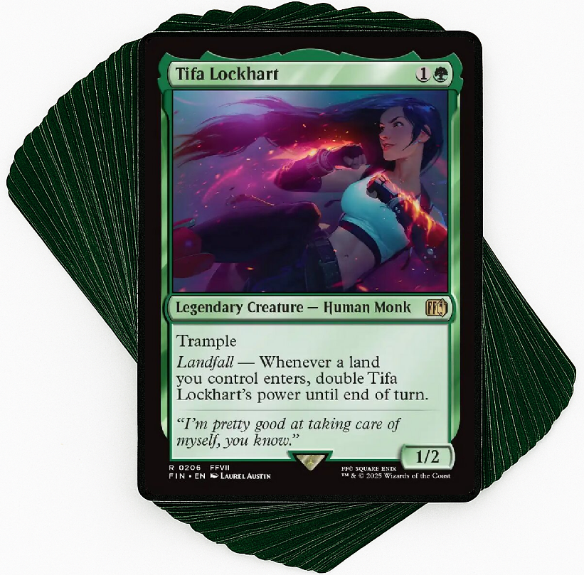 Punch-first landfall! Tifa turns every land drop into counters and combat tricks, letting you swing early and scale late. Ramp hard, drop lands in bursts, and watch your creatures balloon past the table.