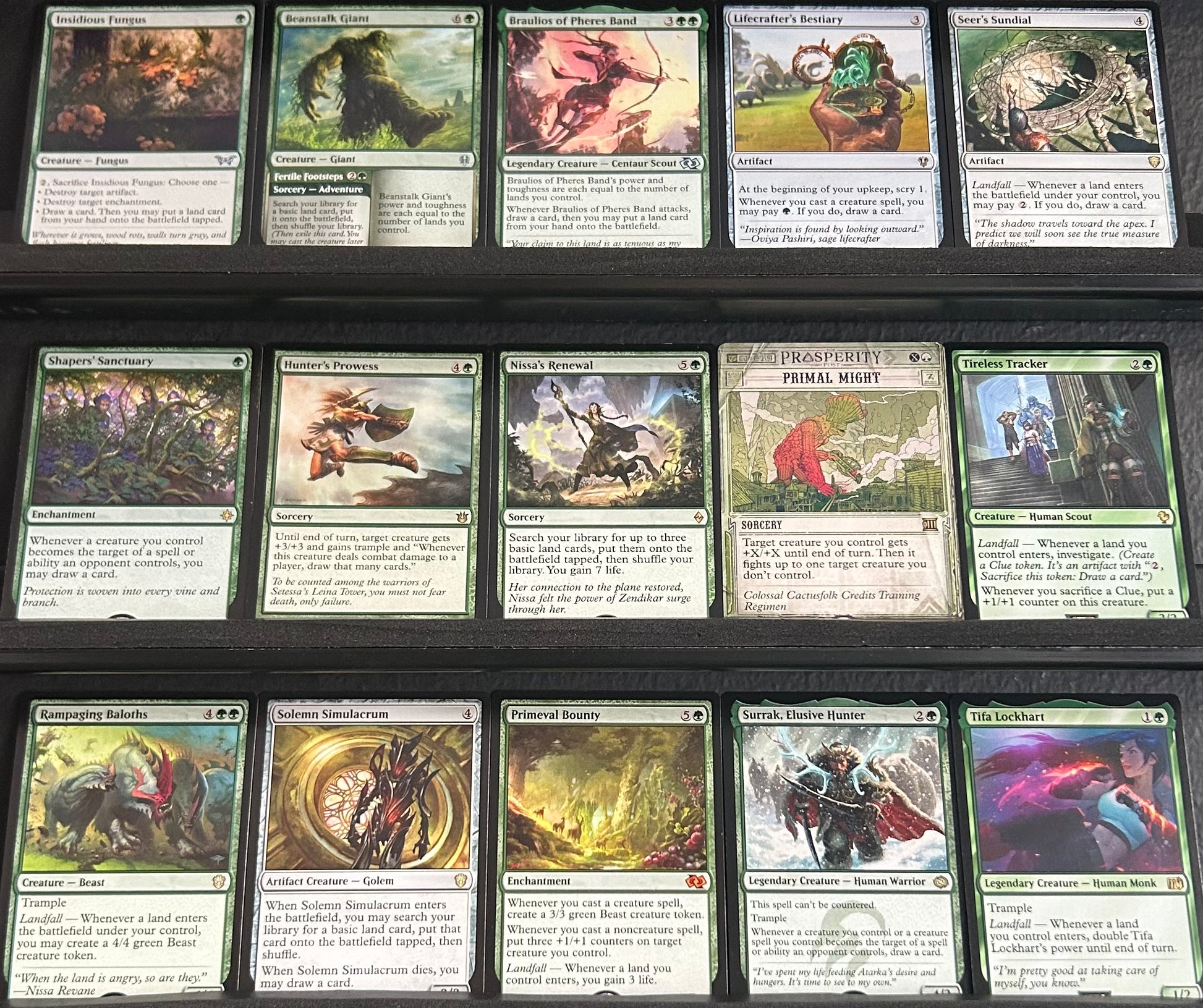 ⢠Value engines Tireless Tracker, Beastcaller Savant (proxy for fast mana), and Braulios of Pheres Band keep cards flowing.