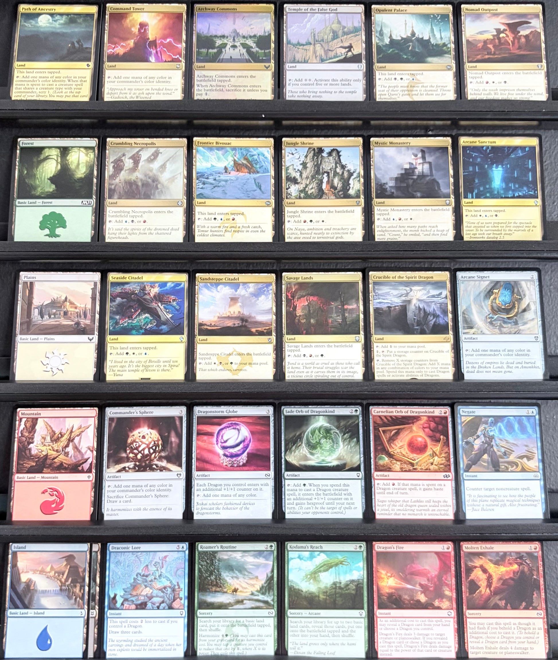 Sol Ring, Arcane Signet, Commander's Sphere, Dragon's Hoard, and Dragonstorm Globe: core ramp and mana fixing that feed your dragon engine.