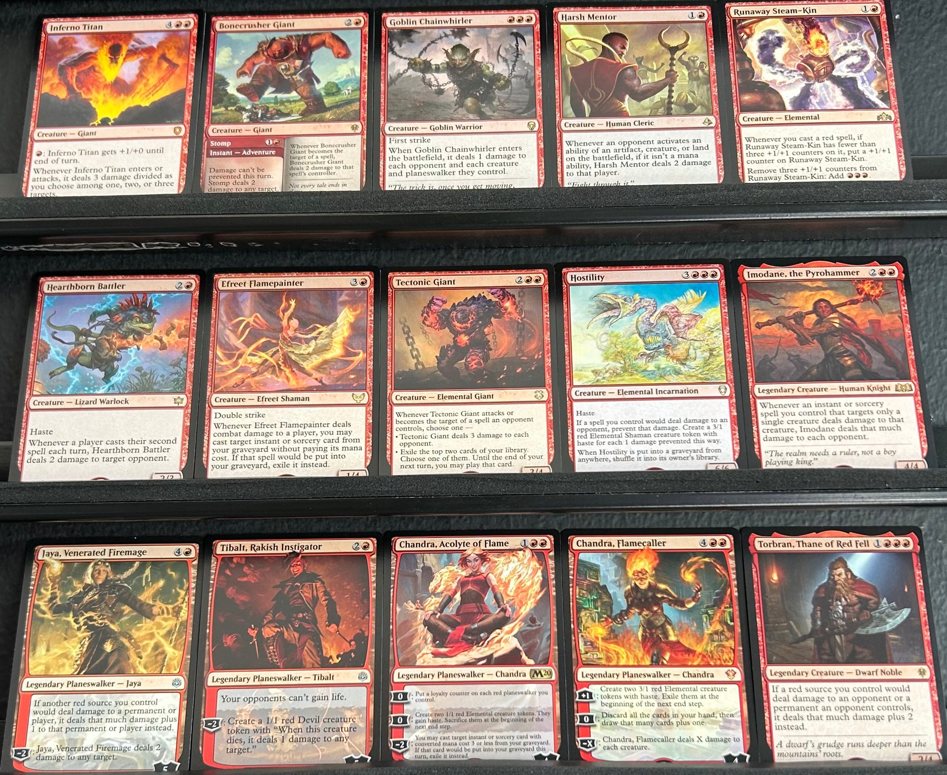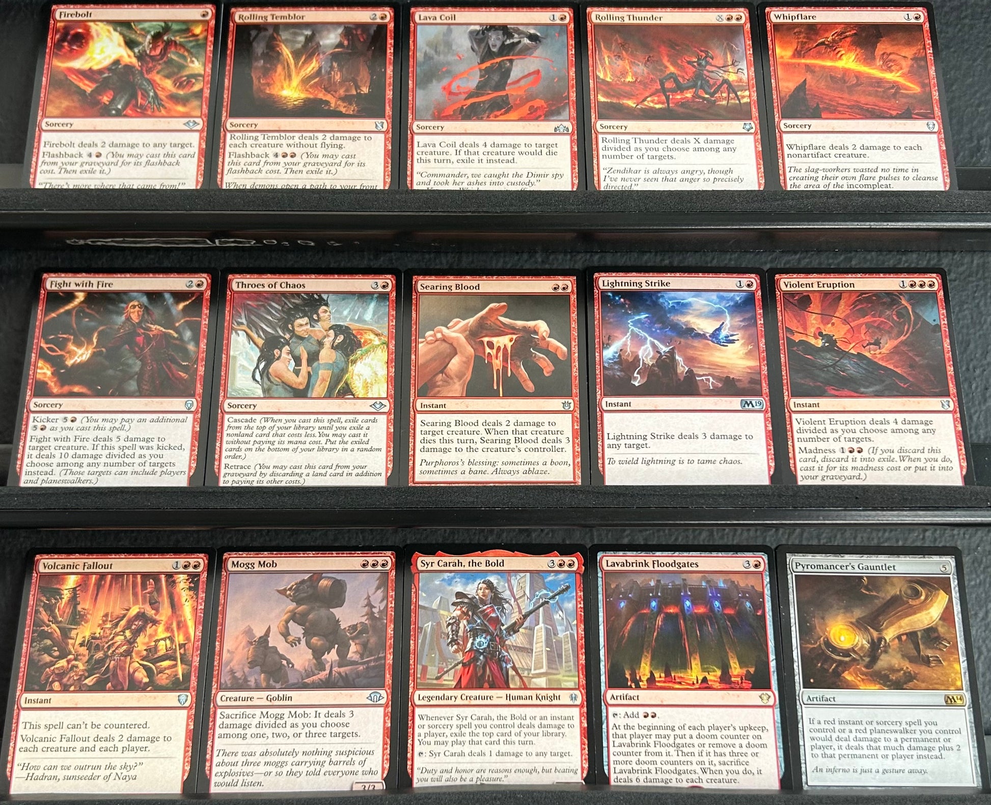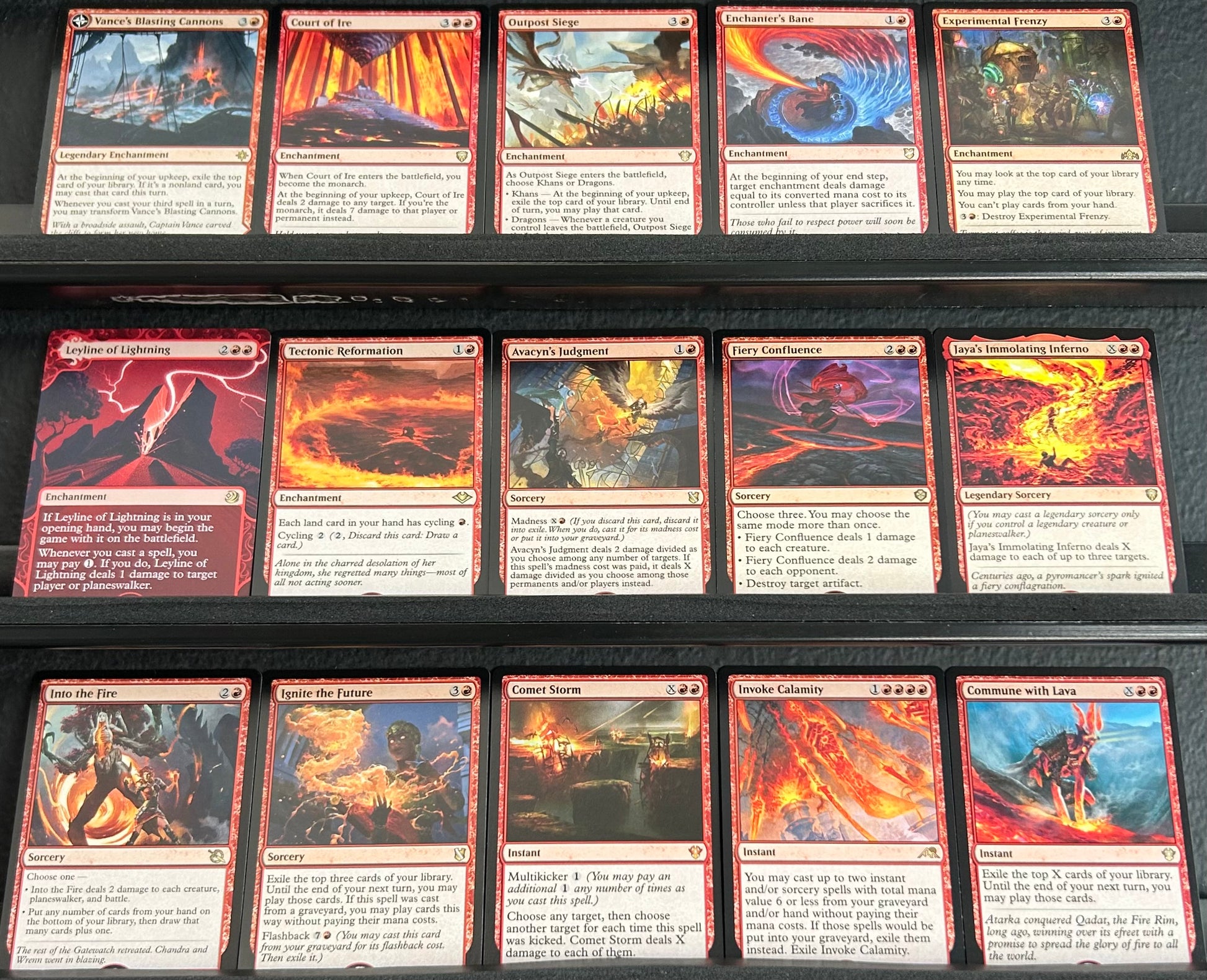 In this infernal arsenal, the burn never fades. Efreet Flamepainter, Invoke Calamity, and Chandra, Acolyte of Flame serve as the conduits of recursion, allowing you to recast your most potent spells from the graveyard time after time. As each card is reborn, its searing damage is unleashed anew, forging a cycle of fiery devastation that wears down your opponents. Additionally, spells with flashback, such as Faithless Looting and Ignite the Future, ensure that no burst of red magic is ever truly lost, letting you tap into the hidden reserves of your deck to maintain a continual barrage of scorching fury. Through these synergies, every ember rekindled fuels an ever-growing inferno, keeping the flames of destruction alive and marking your path to victory with unyielding heat.