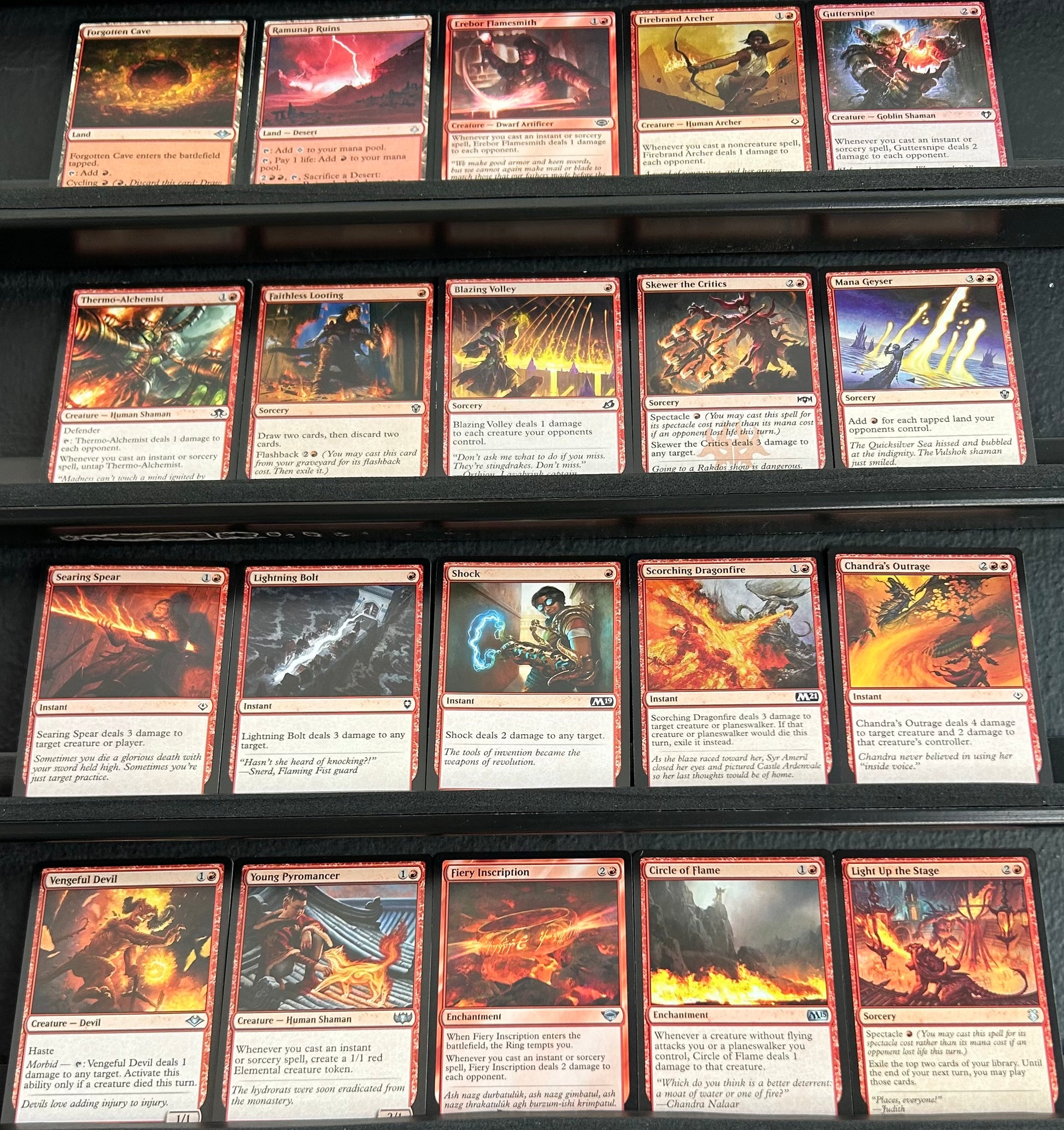 Fueling this inferno is an efficient ramp and draw engine that ensures you always have enough fuel to stoke the flames. Mana Geyser and Runaway Steam-Kin push your explosive spells into play and recursive elements such as Faithless Looting, Experimental Frenzy and Light Up the Stage help maintain a full arsenal, cycling through your deck to find the next explosive burn. These synergies ensure that every turn, no matter how intense, you'll always have another spark ready to ignite the battlefield.