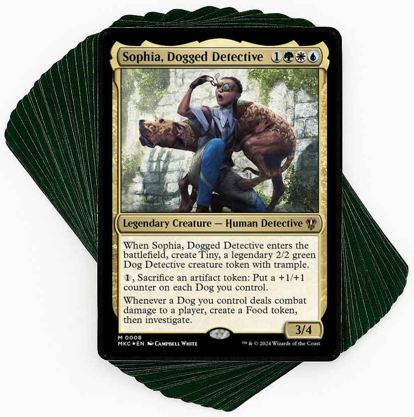 Sophia leads a pack of adorable, determined dogs, generating a flood of clue and food tokens whenever your dogs deal combat damage